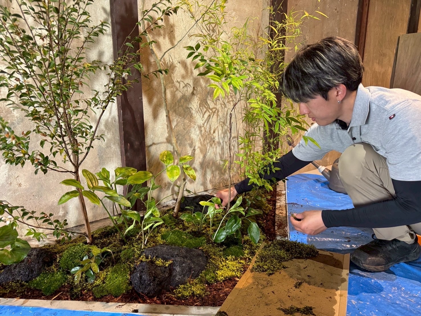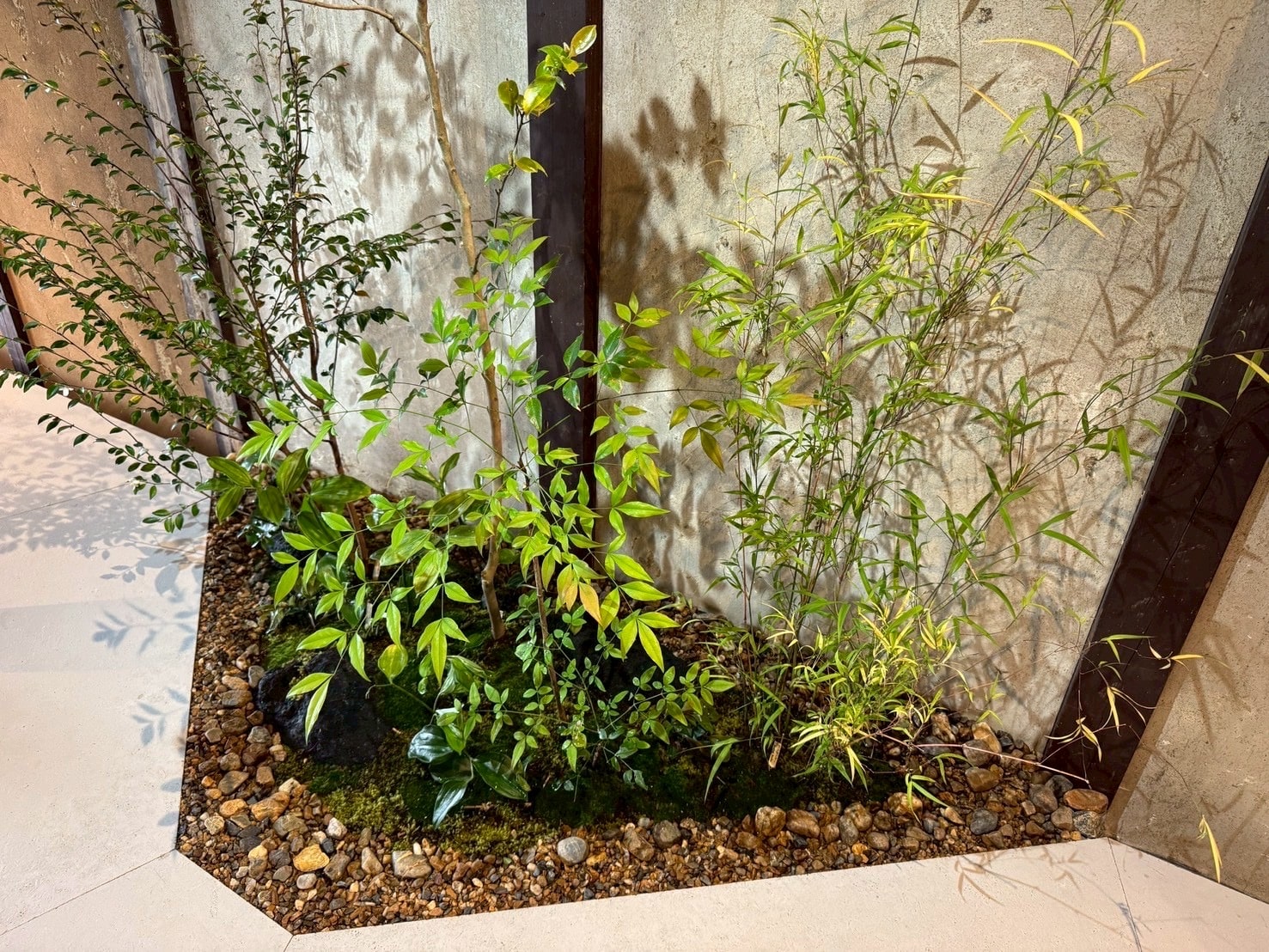 一般的には、 室内の植栽はフェイクグリーンや観葉植物だけの提案が多いですが、京都らしさを意識し、 山取りの植物も取り入れました。